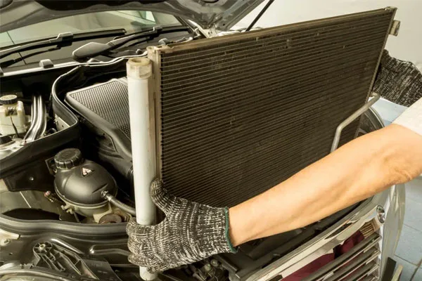 The refrigerant in the form of hot, high-pressure gas travels to the condenser, located in front of the radiator. With outside air flowing through the fins and tubes of the condenser, the refrigerant cools down.